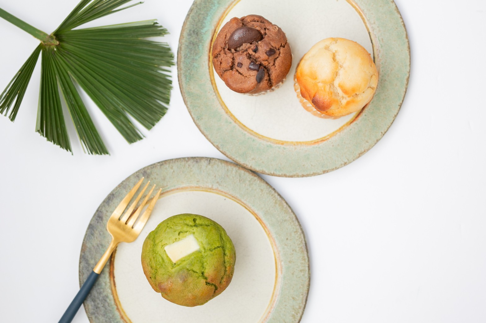 ほんのりとバターがかおる甘すぎないマフィンです。プレーン、チョコレート、抹茶の3種類をご用意しております。テイクアウトも可能です。